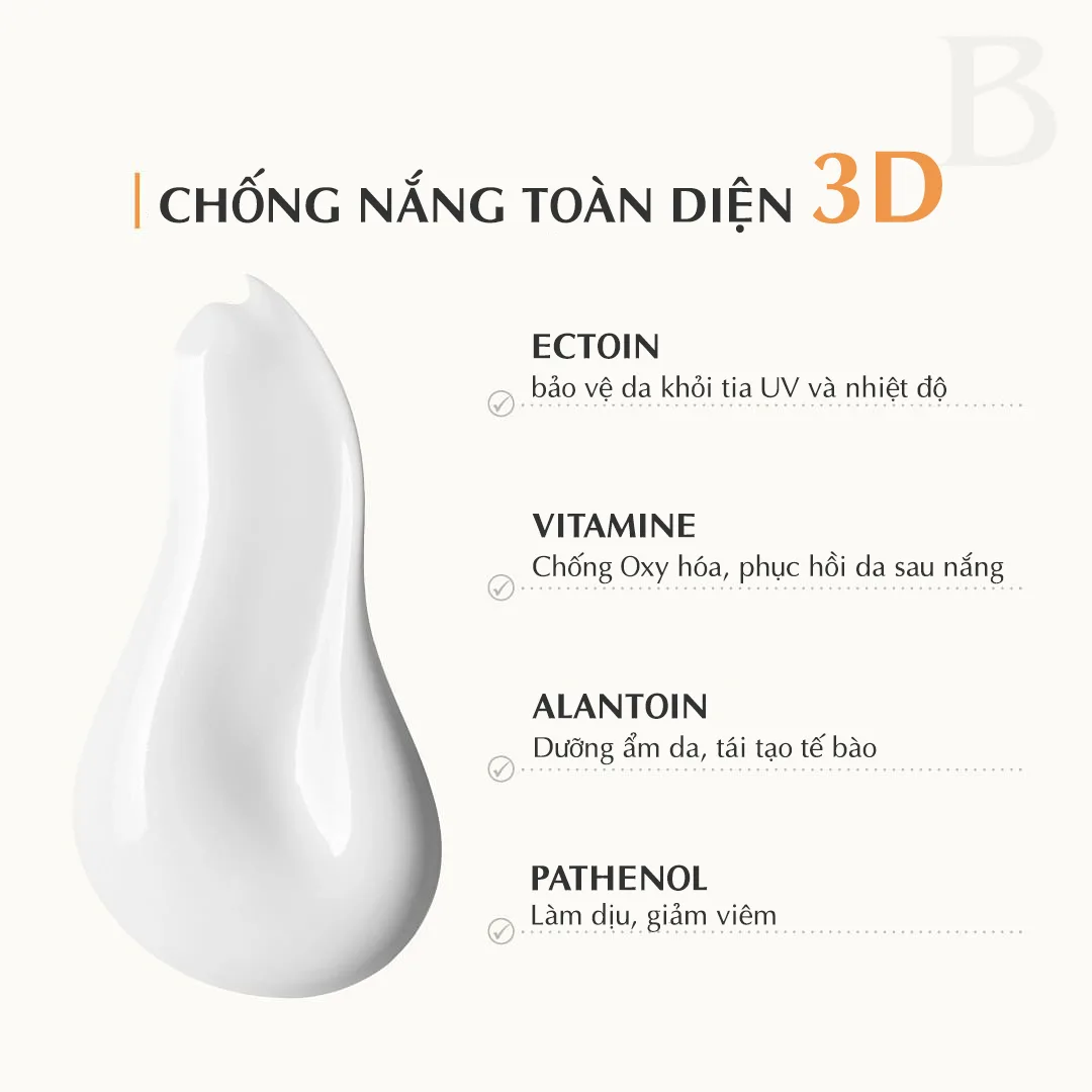 Kem chống nắng cho mặt và toàn thân bảo vệ làn da khỏi tác hại khác của ánh nắng mặt trời. Công thức bảo vệ kép chống lại tia UVA & UVB đã được chứng minh, tạo lớp màng bảo vệ tế bào da và ngăn ngừa hoạt động của melanin. Hợp chất bảo vệ tế bào da Ectoin® ngăn ngừa sự biến đổi sắc tố và dấu hiệu lão hoá da do ánh nắng.