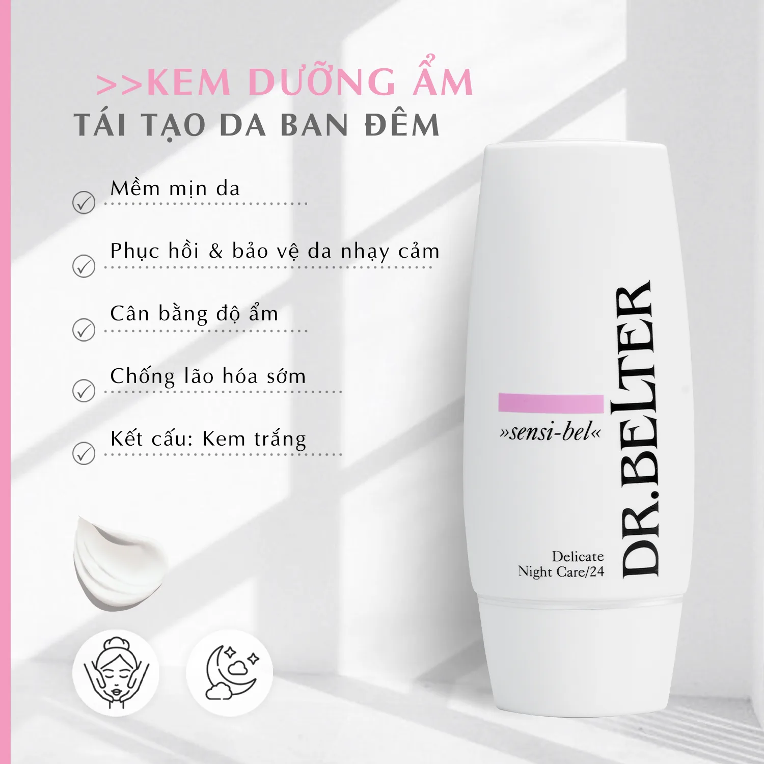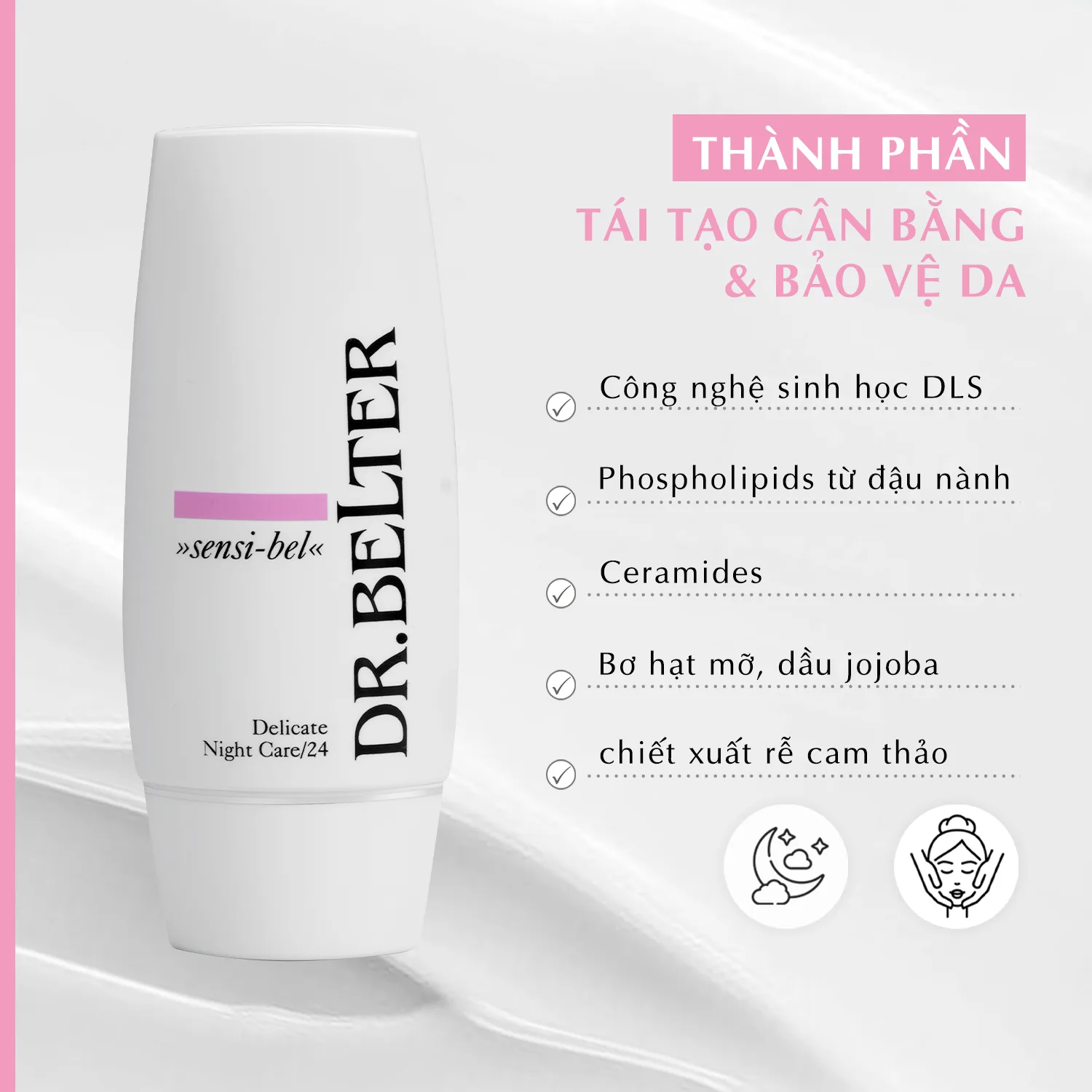 Kem chăm sóc ban đêm dành cho làn da nhạy cảm, da kícḣ ứng. Kem chăm sóc da đặc biệt cung cấp các loại dầu giúp làm dịu, nâng cao khả năng tự chỉnh sửa và tự cho da. Tái tạo sự cân bằng cho làn da, giúp ngăn ngừa lão hóa sớm.