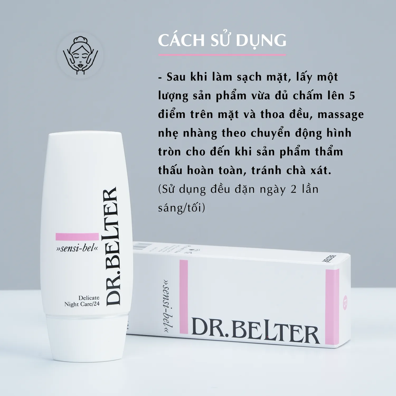 – Kem dưỡng dùng hàng ngày vào buổi tối sau khi da đã được rửa sạch và cân bằng độ ẩm. Lấy một lượng vừa đủ rồi thoa nhẹ nhàng lên da, kết hợp với Delicate Day Care24 để tạo hệ bảo vệ khép kín trong suốt cả ngày cho da.