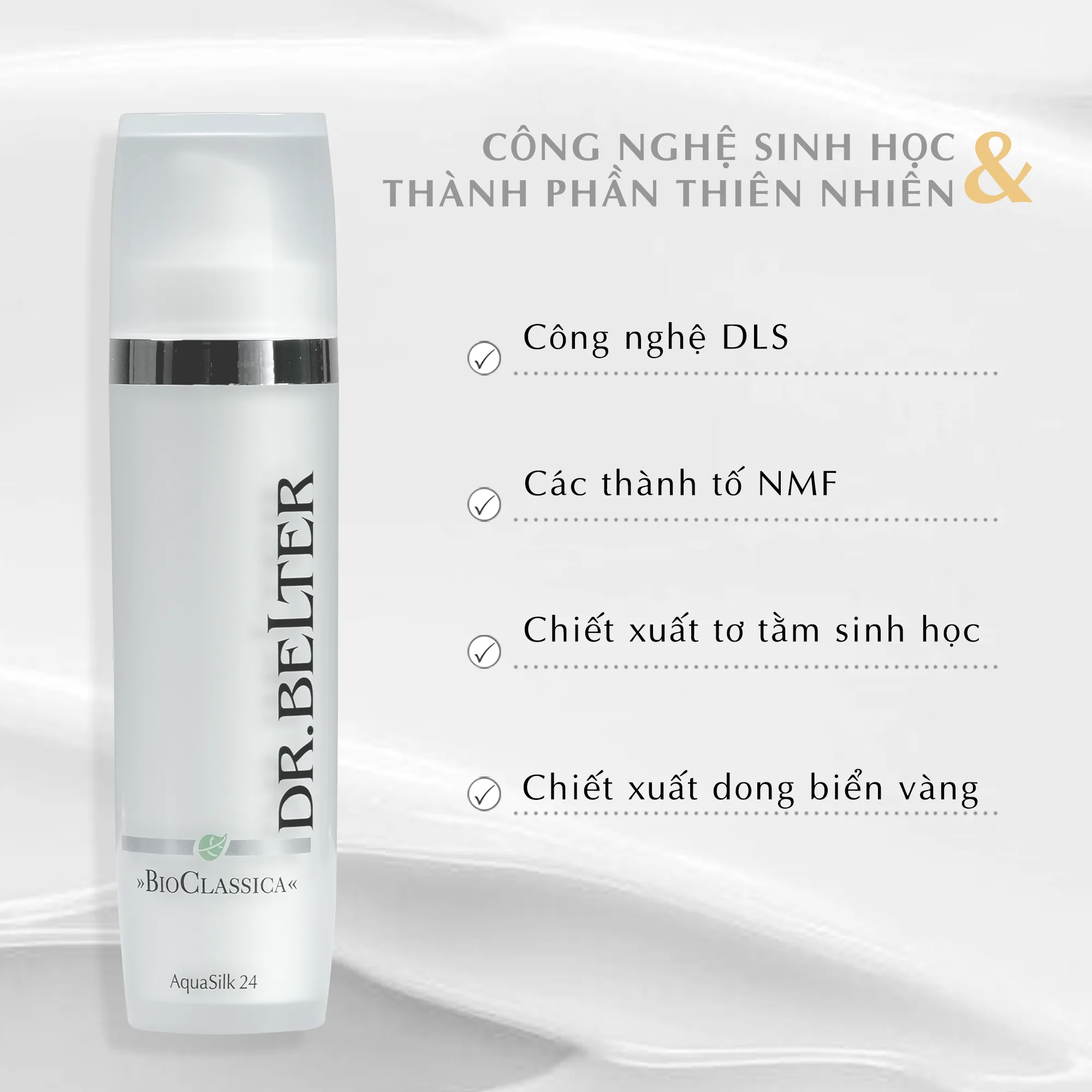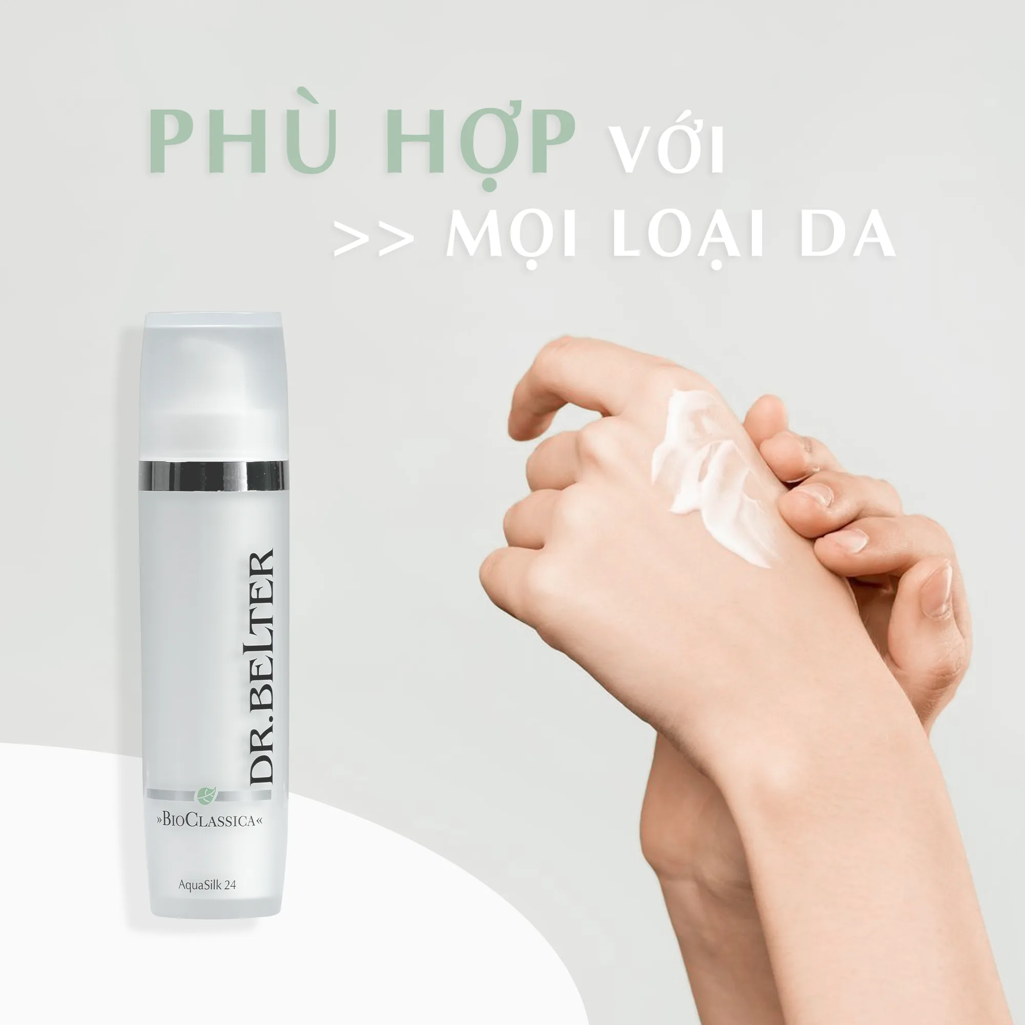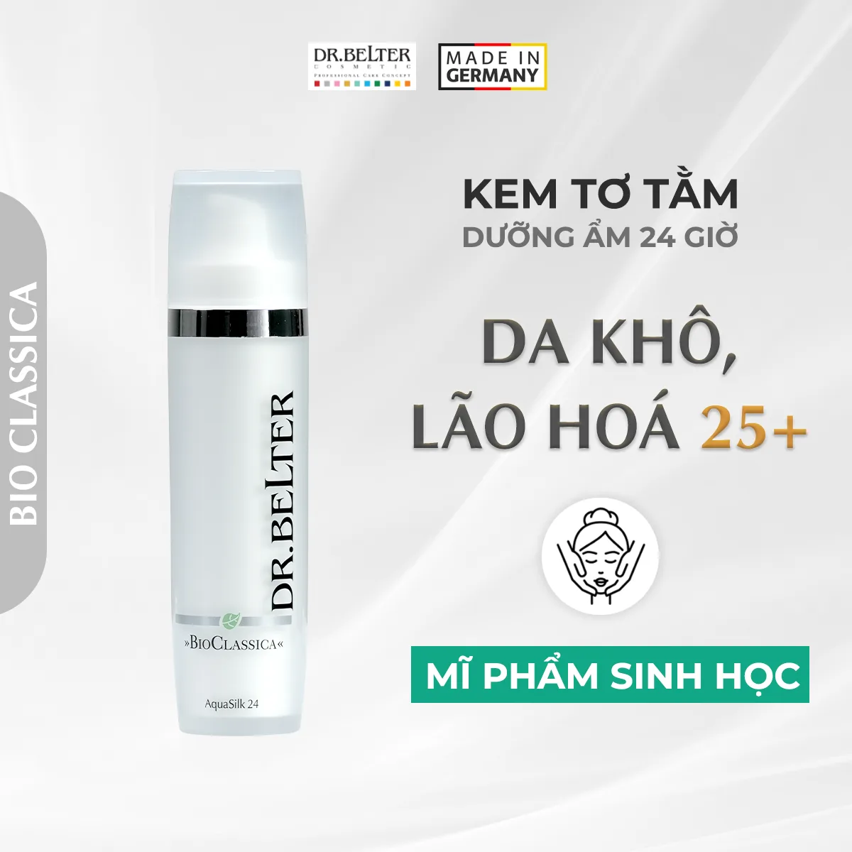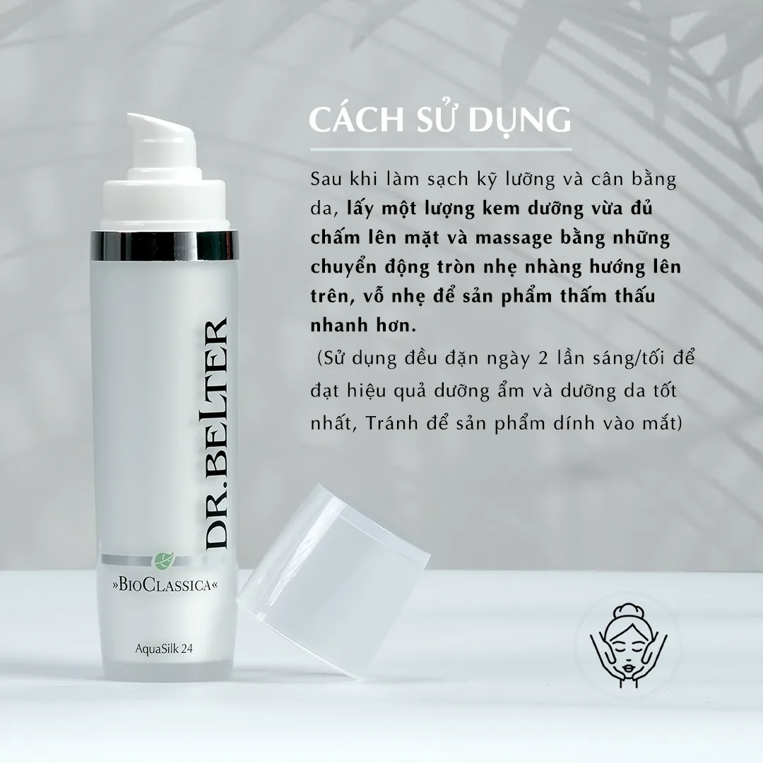 Sau khi làm sạch da và sử dụng nước cân bằng thì thoa BioClassica AquaSilk 24 lên mặt bằng cách sử dụng các chuyển động massage nhẹ nhàng.