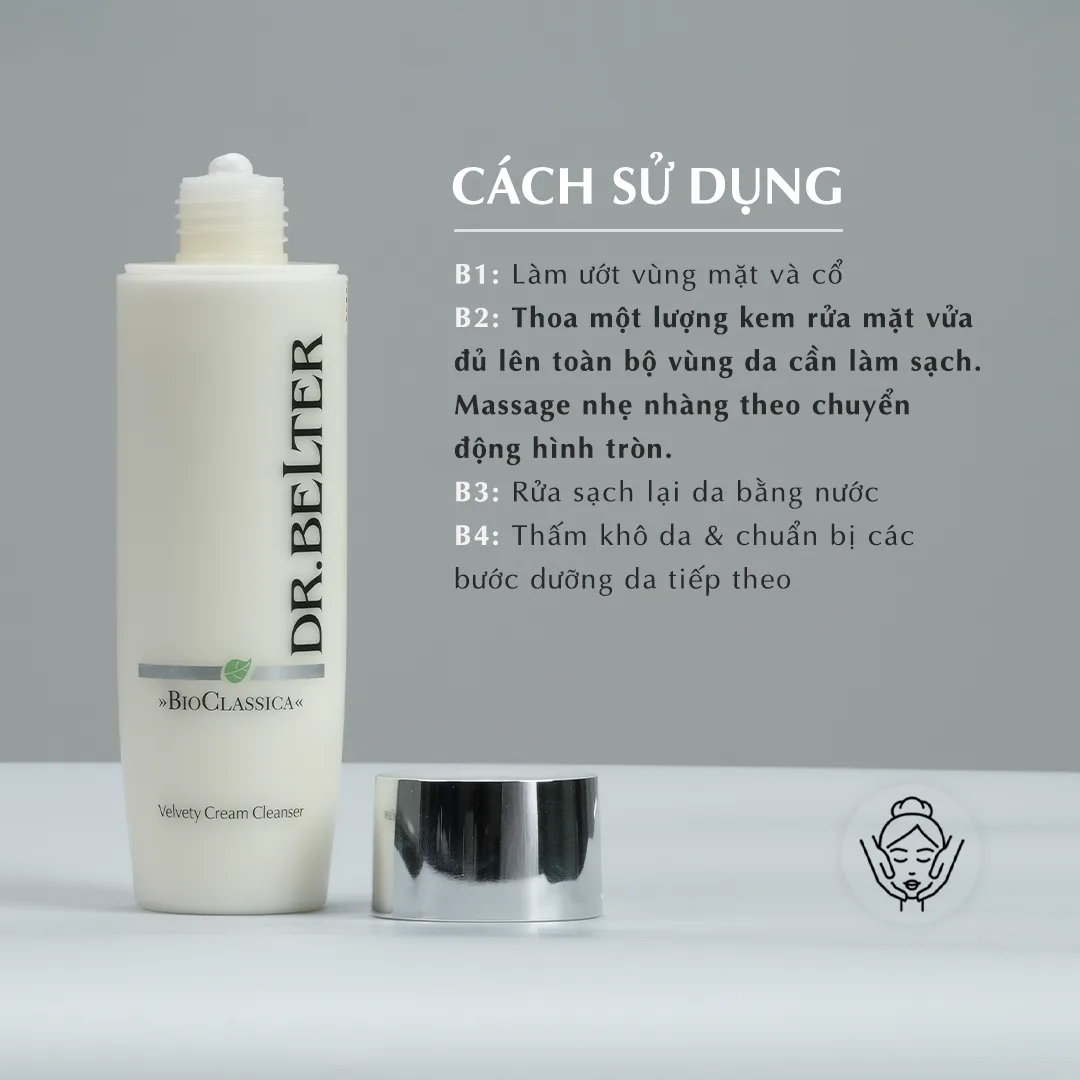 Sau khi tẩy trang vùng mắt, thoa Velvety Cream Cleanser lên toàn bộ mặt đã được làm ẩm sử dụng những chuyển động hình tròn. Sữa rửa mặt dạng kem nhẹ nhàng loại bỏ tạp chất và lớp trang điểm, rửa sạch với nhiều nước ấm. Tiếp theo sử dụng sản phẩm cân bằng độ ẩm và các sản phẩm chăm sóc của Dr.Belter